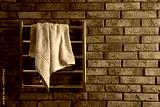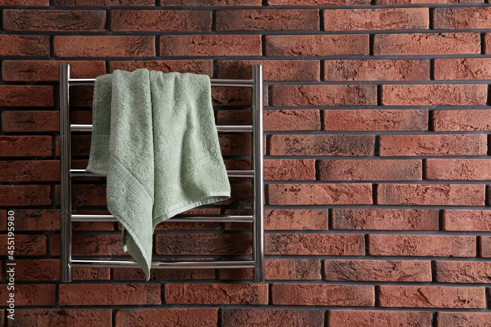 Modern heated towel rail with warm soft towel on red brick wall. Space for text