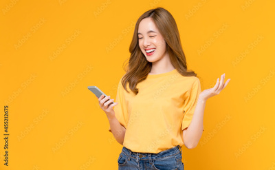 Studio shot of Beautiful Asian woman holding smartphone and smiling on light yellow background