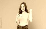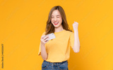 Studio shot of Beautiful Asian woman holding smartphone and smiling on light yellow background