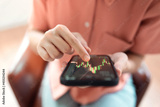 Closeup - Woman is checking Bitcoin price chart on digital exchange on mobile smartphone, cryptocurrency future price action prediction.