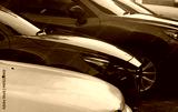 Car parked at parking lot of the airport for rental. Side view of red, blue SUV car. Used luxury car for sale and rental service. Automobile parking space. Car dealership concept. Automotive industy.
