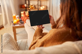halloween, holidays and leisure concept - young woman with tablet pc computer at home