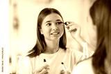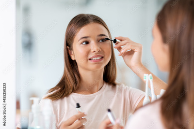 beauty, make up and cosmetics concept - teenage girl applying eye makeup with mascara and looking to mirror at home bathroom