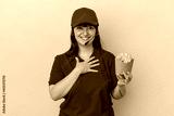 Young curvy caucasian woman fast food restaurant worker holding fries isolated on blue background laughs out loudly keeping hand on chest.