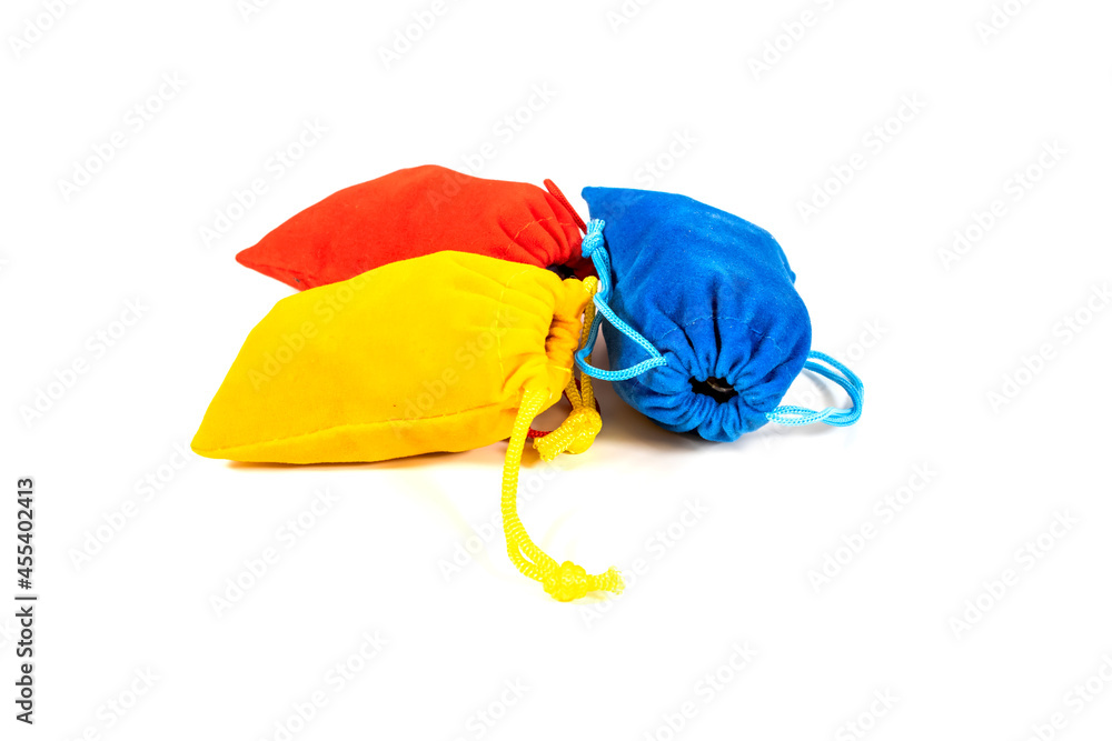 Three colorful pouch's with gems and stones isolated on white background