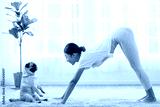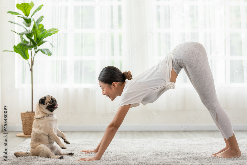 woman practice yoga Downward Facing dog or yoga Adho Mukha Svanasana pose to meditation and kissing her dog pug breed enjoy and relax with yoga in bedroom,Recreation with Dog Concept