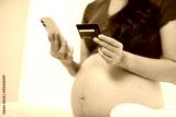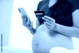 Happy pregnant woman using credit card shopping online at home.Mother purchasing baby clothes from internet online store by mobile phone.Pregnancy Shopping Online Concept