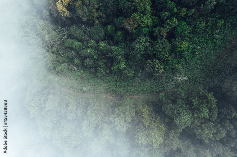 Pine forest in the mountains in the morning from above