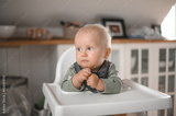close up portrait of cute boy smiling eating baby food. Happy childhood