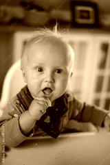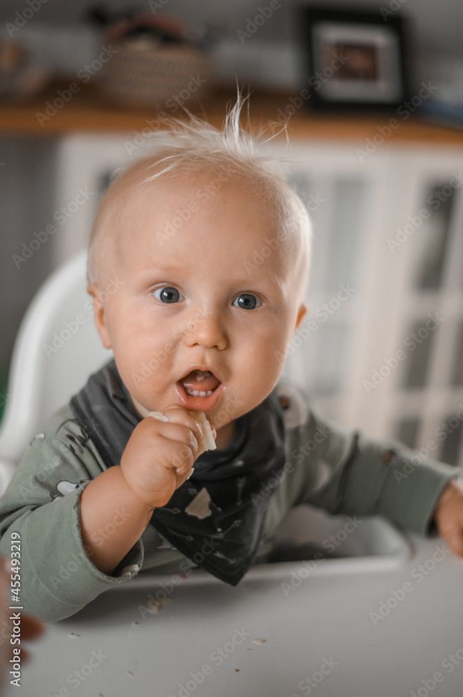 close up portrait of cute boy smiling eating baby food. Happy childhood