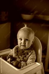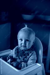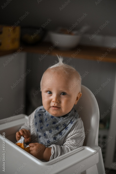 close up portrait of cute boy smiling eating baby food. Happy childhood