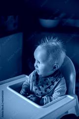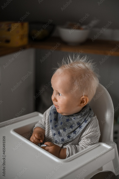 close up portrait of cute boy smiling eating baby food. Happy childhood