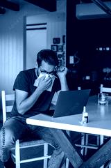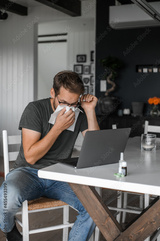 attractive nerdy man with glasses freelance working from home during the covid pandemic or flu