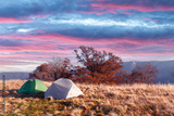 Two tents on amazing meadow in autumn mountains. Landscape photography, travel concept
