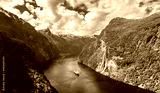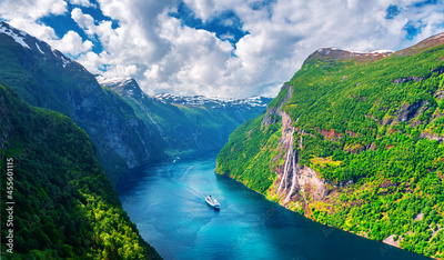 Panorama of breathtaking view of Sunnylvsfjorden fjord and famous Seven Sisters waterfalls, near Geiranger village in western Norway. Landscape photography