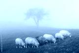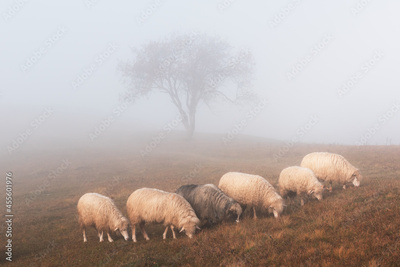 Herd of sheeps in foggy autumn mountains. Carpathians, Ukraine, Europe. Landscape photography