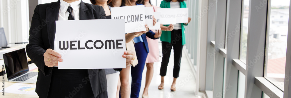 Group of unrecognizable people joins together greeting and hold welcome words for a sign of happiness and pleasure for coming of something or someone