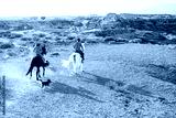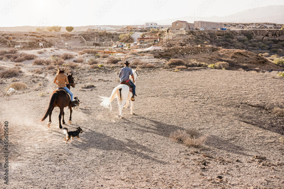 Young couple riding horses doing excursion with dog pets at sunset - Main focus on woman back