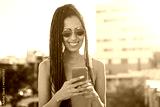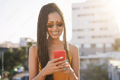 Bohemian african girl using mobile phone outdoor with city in background - Focus on face