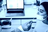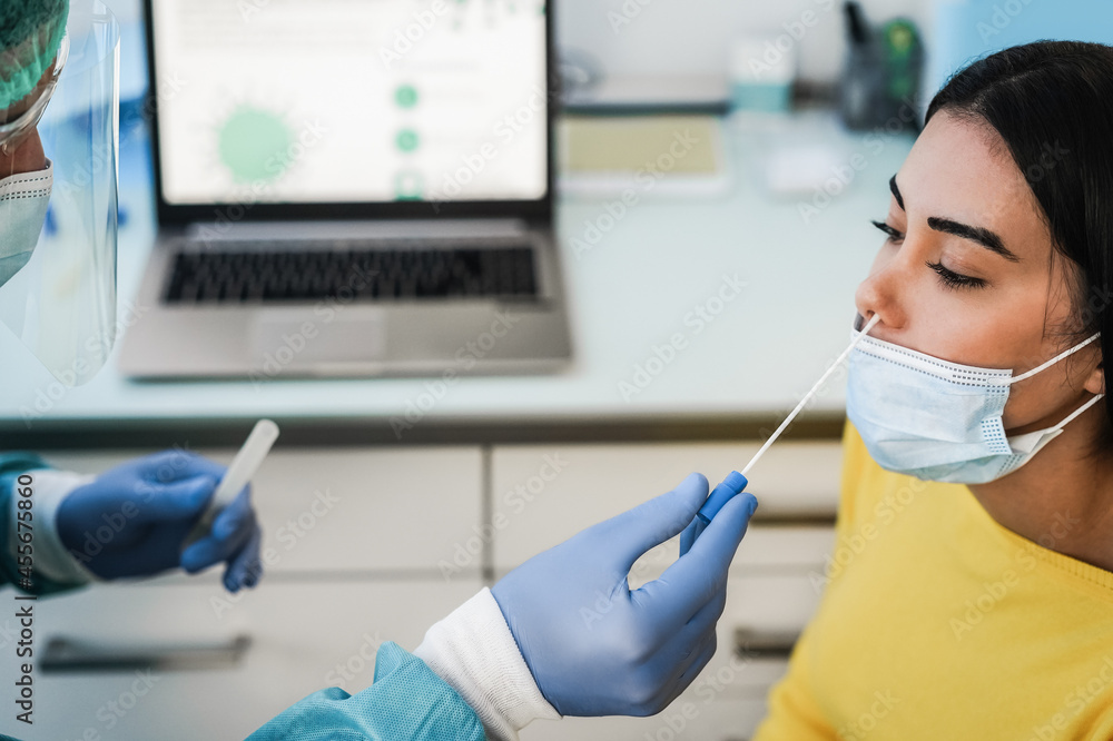 Doctor making swab nasal test to young woman in medical clinic for coronavirus infection - Focus on girl eye
