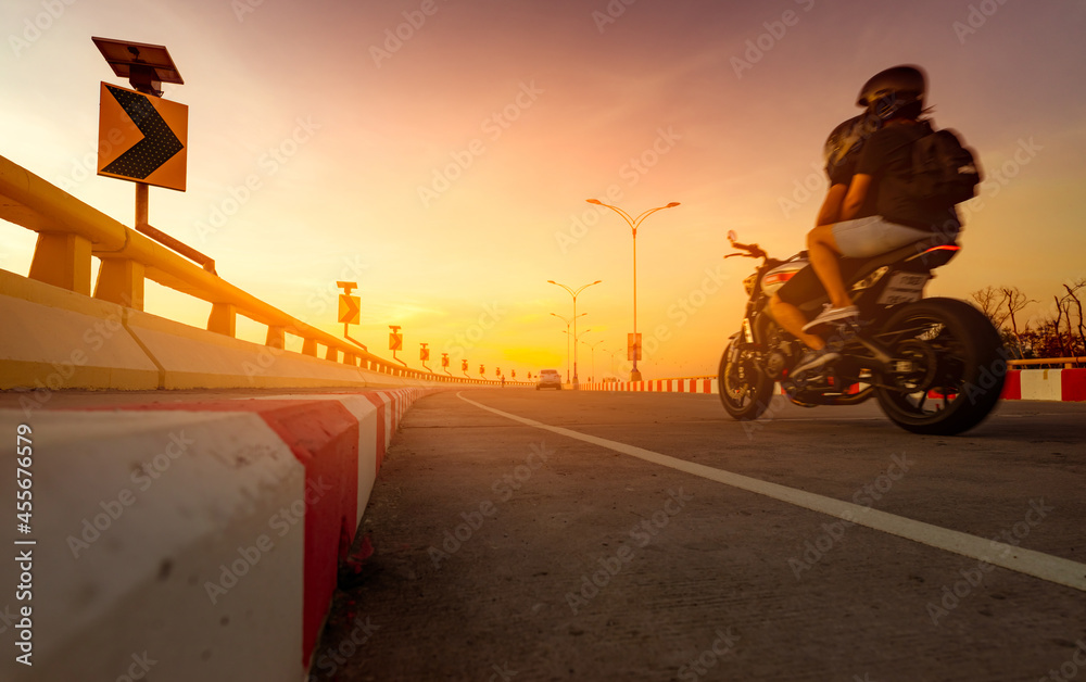 Solar panel energy on yellow curve traffic sign and motion blur of biker riding motorcycle on curve road. Road trip on summer vacation. Summer travel of Love couple by motorbike. On the way to home.