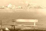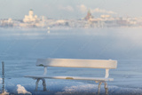 Traditional wooden and frosty resting bench in Helsinki, Finland on extremely cold winter morning with freezing Baltic Sea and downtown Helsinki skyline on the background.