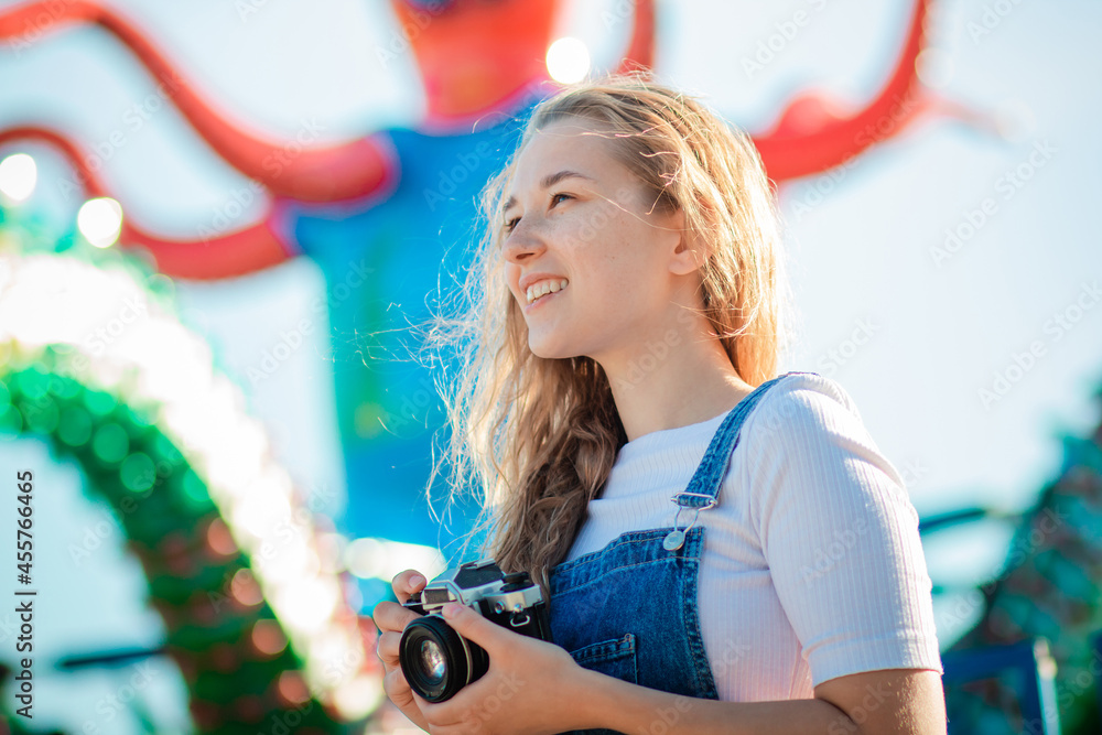 A young woman tourist in a denim sundress stands with cameras in an amusement park.