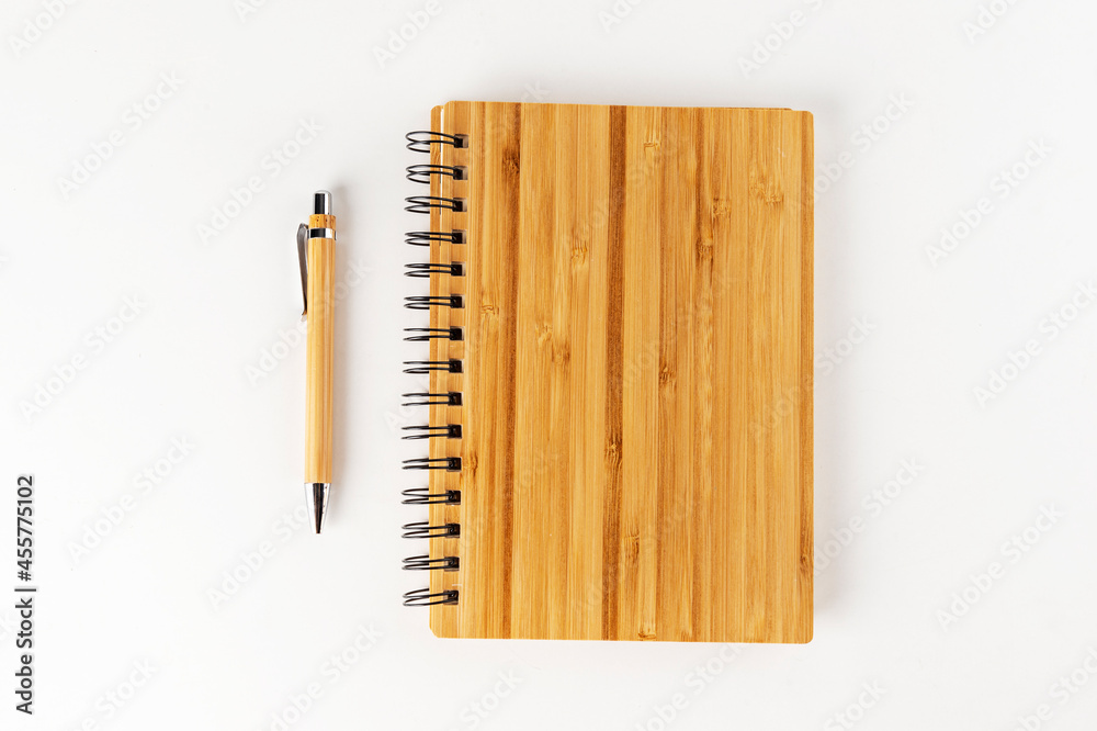 bamboo notebook and pen on a white background