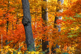 Bright color trees during peak autumn time in Michigan upper peninsula deciduous forest.