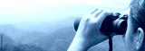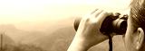 Young girl looks through binoculars on mountains background