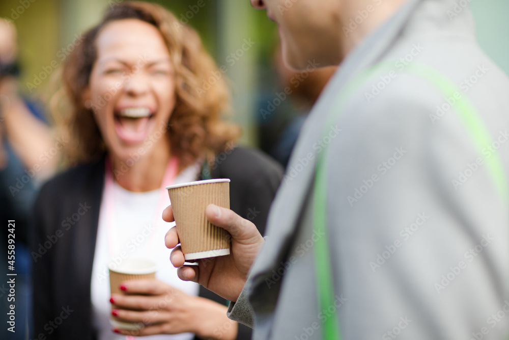 People holding coffee cups during conference break