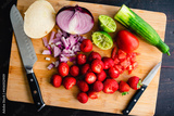 Prepping Fruit and Vegetables on a Bamboo Cutting Board: Chopped fruits and vegetables with a santoku knife and a paring knife on a wood background