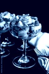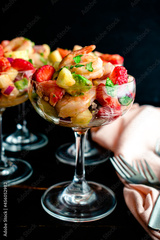 Strawberry Shrimp Ceviche Cocktails Served in Coupe Glasses: Shrimp salad served cocktail style in a champagne saucer
