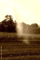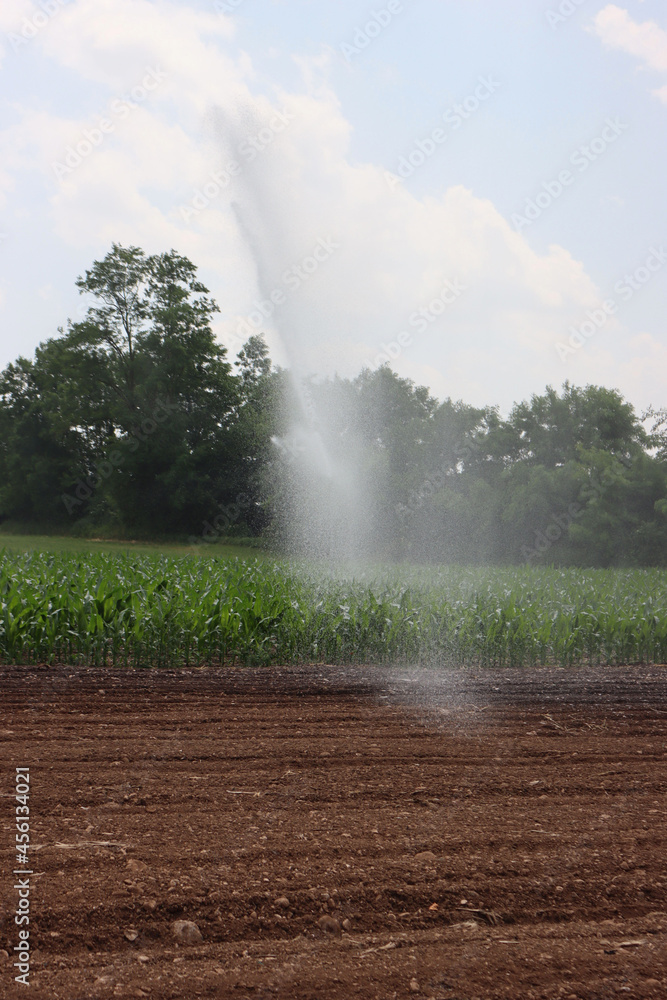 Agricultural irrigation system watering green corn field on sunny summer day against ble sky in the northern italian countryside