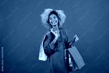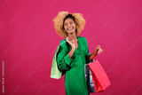 Joyful afro woman holding colorful paper bags over an isolated background. Black Friday sale concept.
