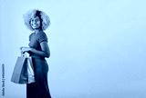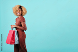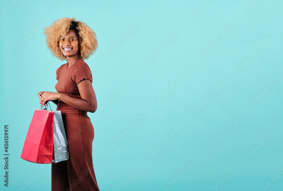 Smiling woman holding colorful shopping bags. Black Friday sales season concept.