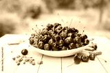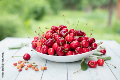 Cherry (merry) berry heap with leaves on wooden table in garden closep. Food photography