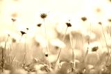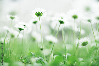 Closeup nature view of green creative layout made of green grass and daisy flowers on spring meadow. Natural background