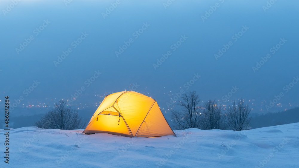 Yellow tent lighted from the inside against the backdrop of glowing city lights in fog. Amazing snowy landscape. Tourists camp in winter mountains. Travel concept
