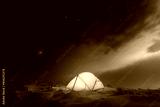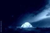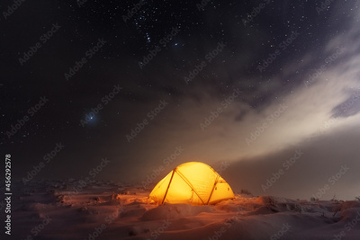 Yellow tent lighted from the inside against the backdrop of glowing city lights and incredible starry sky. Amazing night landscape. Tourists camp in winter mountains. Travel concept