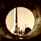 A glass of whiskey in old oak barrel. Copper alambic on background. Traditional alcohol distillery concept