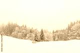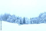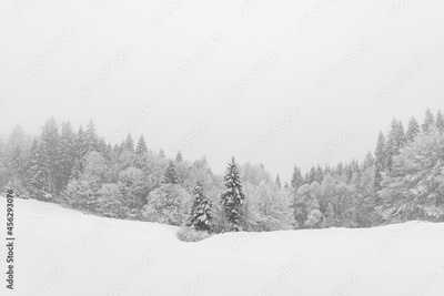 Minimalistic winter landscape in cloudy weather with snowy trees. Carpathian mountains, Landscape photography
