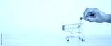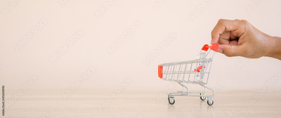 Close up the mini shopping cart on desk concept using the internet application for online shopping buying and spending on computer technology.