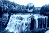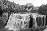 A hot air balloon flying low over the middle falls at Letchworth State Park in New York. The falls are shown in long exposure.