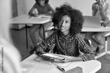 Happy African American schoolgirl looking listening to teacher using tablet device sitting in classroom with group of schoolchildren using laptop computers. Modern technologies for education concept.