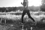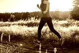 Woman running in nature during summer sunset. Female runner jogging outdoors. Sport and active lifestyle