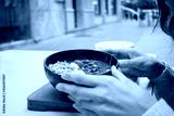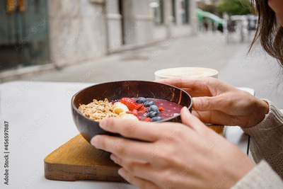 Delicious breakfast bowl and coffee in a cup. Concept of healthy food. Breakfast outdoor. Close up
