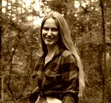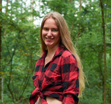 an attractive smiling Caucasian female wearing a ref flannel shirt in the forest