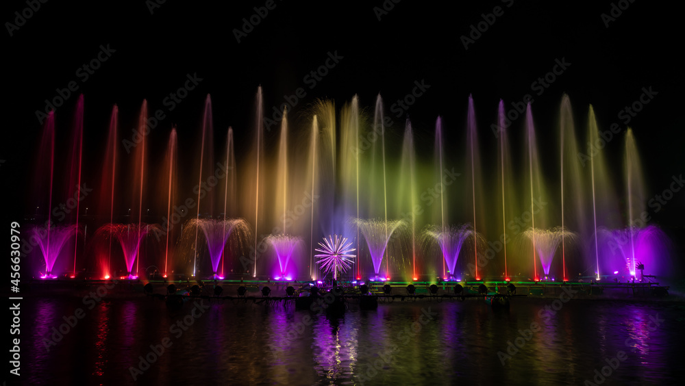 The colorful fountain dancing in celebration festival with dark night sky background.