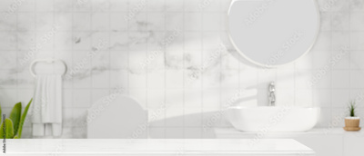 Mock-up space on white tabletop for montage spa or bath products over white bathroom, 3d rendering